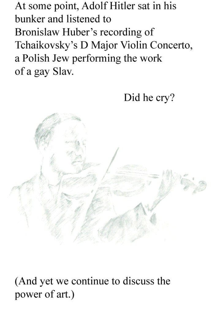 The sound is derived from a number of sources including Bronislaw Huber’s recording of Tchaikovsky’s D Major Violin Concerto, a recording found in Hitler’s bunker, and recordings of vandalism on the day of Donald Trump’s inauguration.